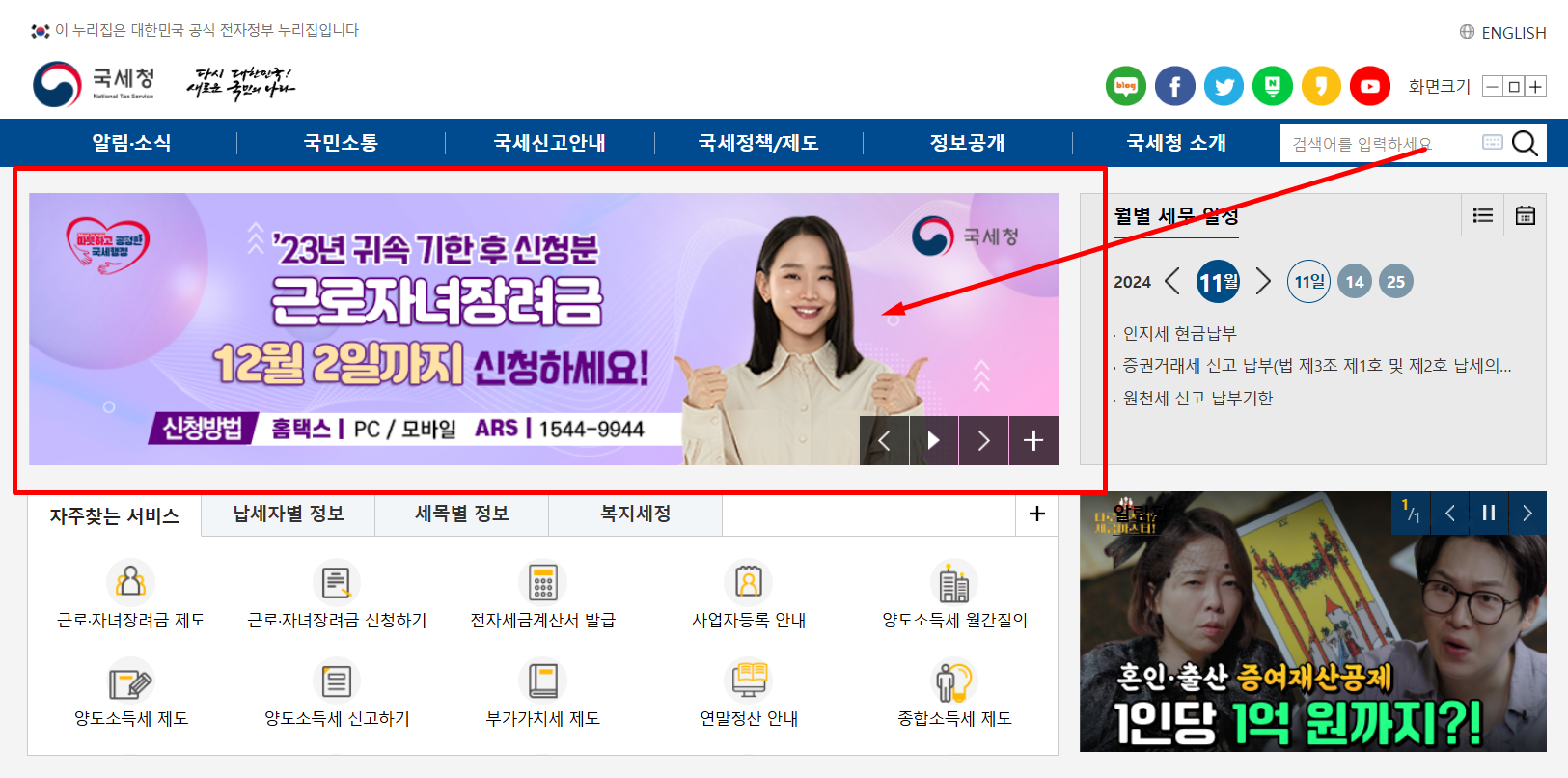 - 국세청 홈페이지 접속: 네이버에서 "국세청"을 검색해 접속한 후 국세청 메인 화면에서 근로장려금 배너를 클릭하세요.