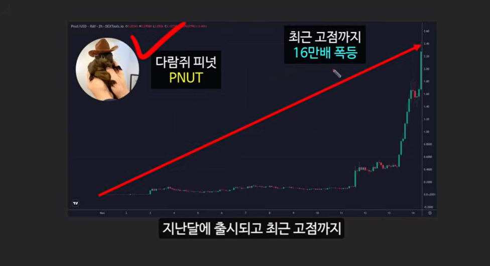 바로 피넛 코인(Peanut Coin)입니다. 피넛 코인은 다람쥐 피너스를 모티브로 만들어졌으며, 짧은 시간 안에 큰 상승을 기록했습니다.