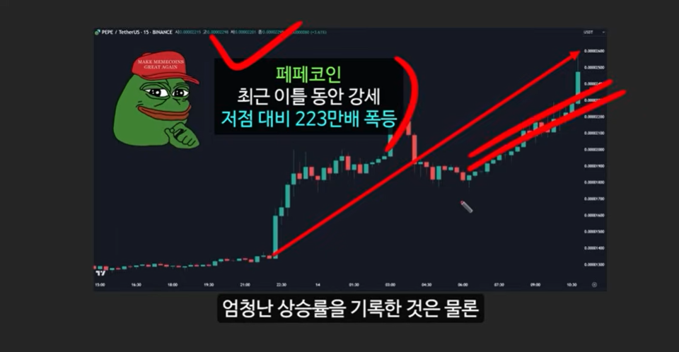 - 투자 사례: 단돈 2달러로 페페 코인을 매수한 한 투자자는 최근 고점에서 860억 원 이상의 수익을 벌어들이며 화제가 되었습니다. 이는 밈 코인의 높은 변동성과 함께 엄청난 잠재적 수익을 보여주는 좋은 사례입니다.
