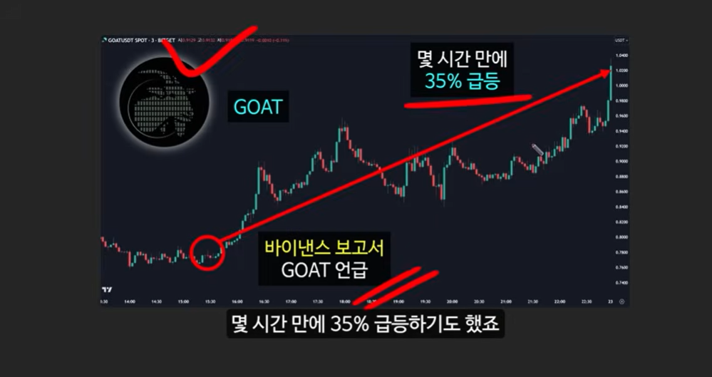 - 벤처 투자가와의 접점: 마크 앤드리슨은 고트 코인을 홍보하는 AI 봇에게 비트코인을 기부하였고, 이는 고트 코인의 신뢰도를 높였습니다. 이후 고트 코인은 세계 최대의 코인 거래소 바이낸스에 상장되어 큰 폭의 상승을 기록했습니다.