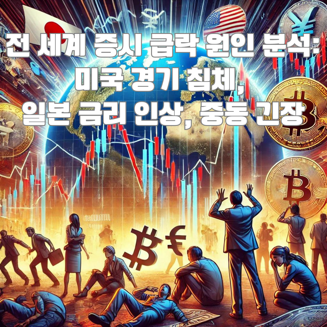 전 세계 증시 급락은 미국의 경기 침체 전망, 중동의 지정학적 긴장, 일본의 금리 인상, 그리고 암호화폐 시장의 급락 등 여러 요인이 복합적으로 작용한 결과입니다.
